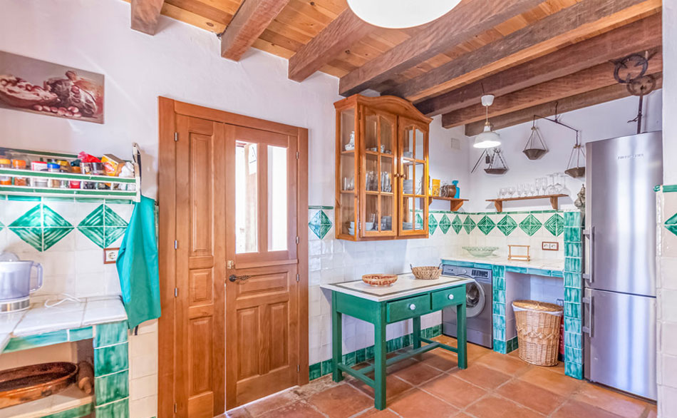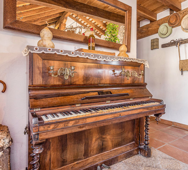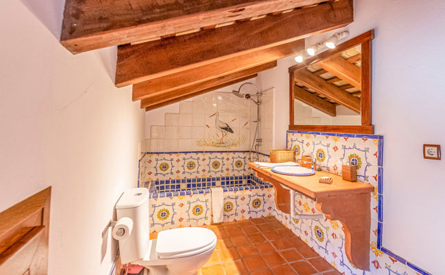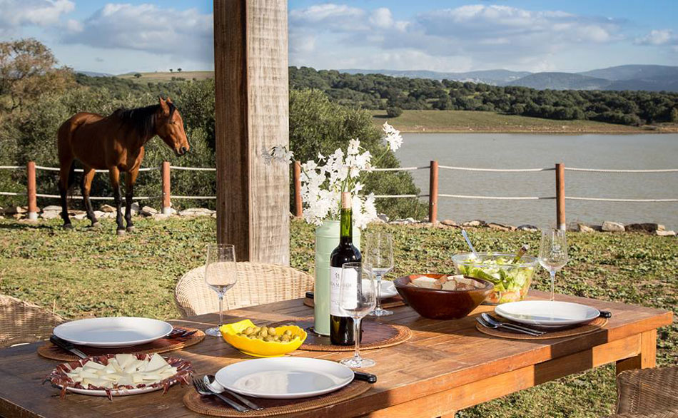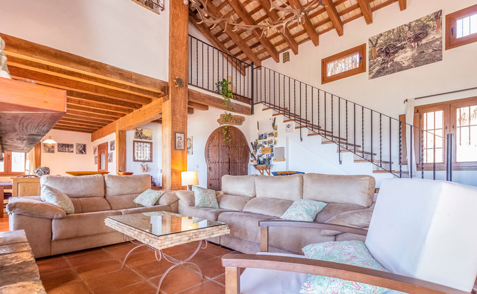 Paseando por la casa, la decoración sorprende por su mestizaje y su variedad de estilos, pero impronta de un espíritu claramente auténtico, funcional y campero donde la comodidad y la huida de lo complicado lo preside todo. Encontramos piezas vintage, muebles étnicos de importación junto a otros traídos de diferentes mercadillos de antigüedades y las recuperaciones hechas por los dueños, a partir de trastos viejos a los que conceder una segunda vida, así como objetos de rabioso diseño propio como las lámparas hechas con desmogues de ciervo y utensilios varios fabricados por artesanos locales, con corcho de los árboles de la propia finca.