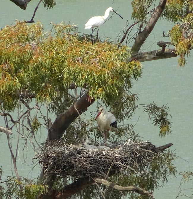 En nuestras pajareras, a sólo 100 metros de la casa hay una colonia de cigüeña blanca, que se ve acompañada cada año por garzas reales, grajillas y dependiendo del año de espátulas que sacan adelante su prole entre nosotros.